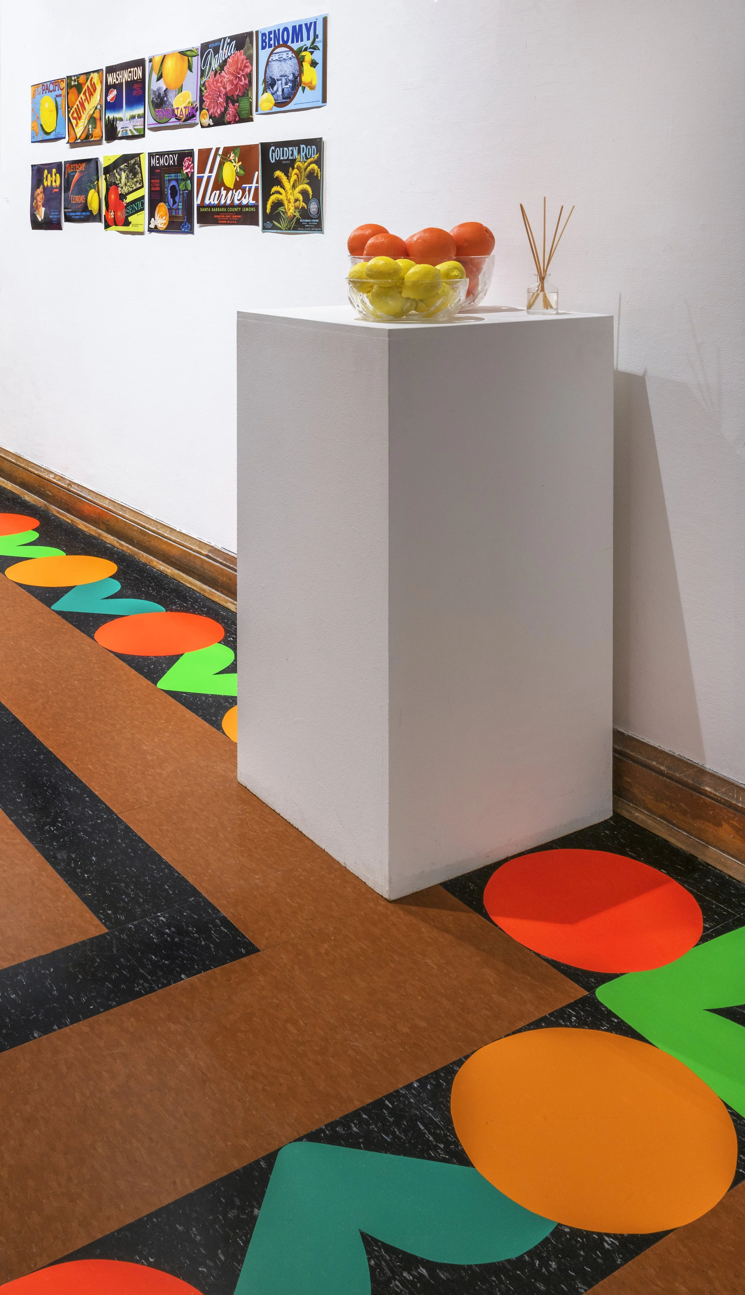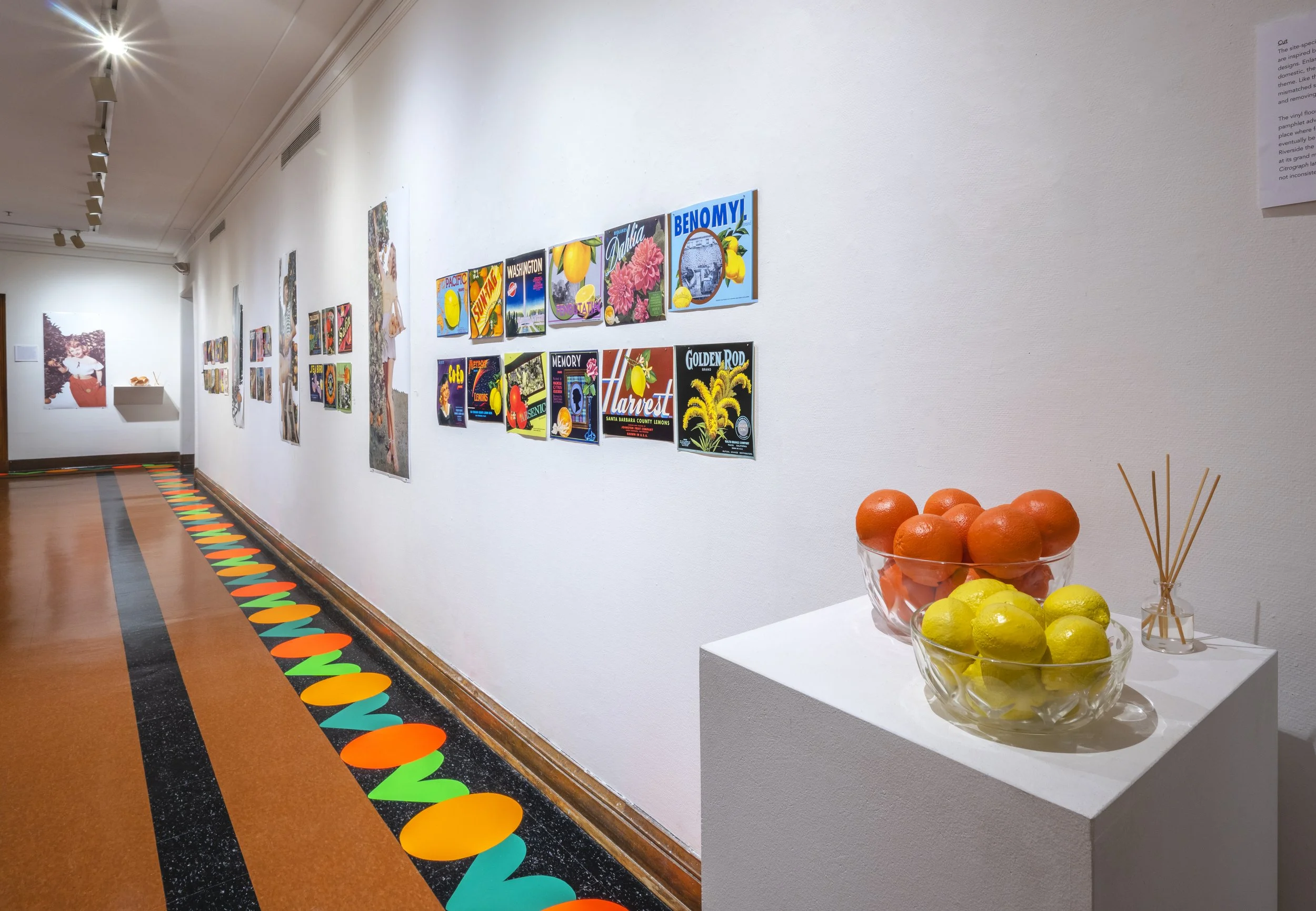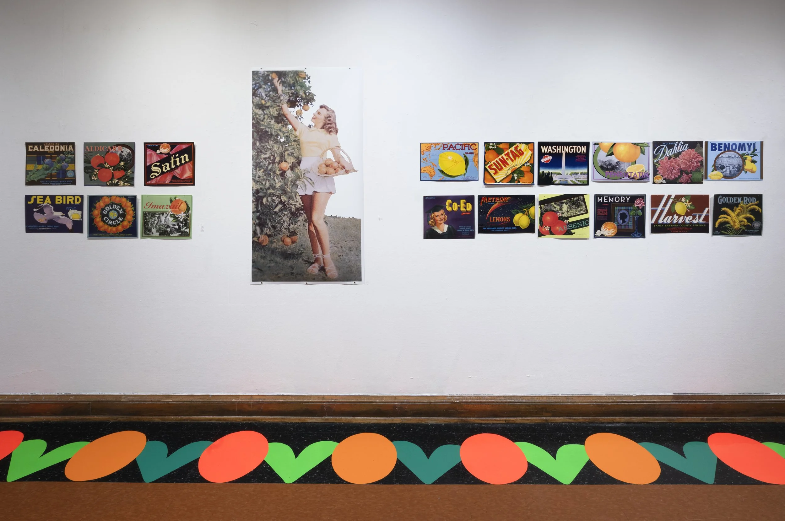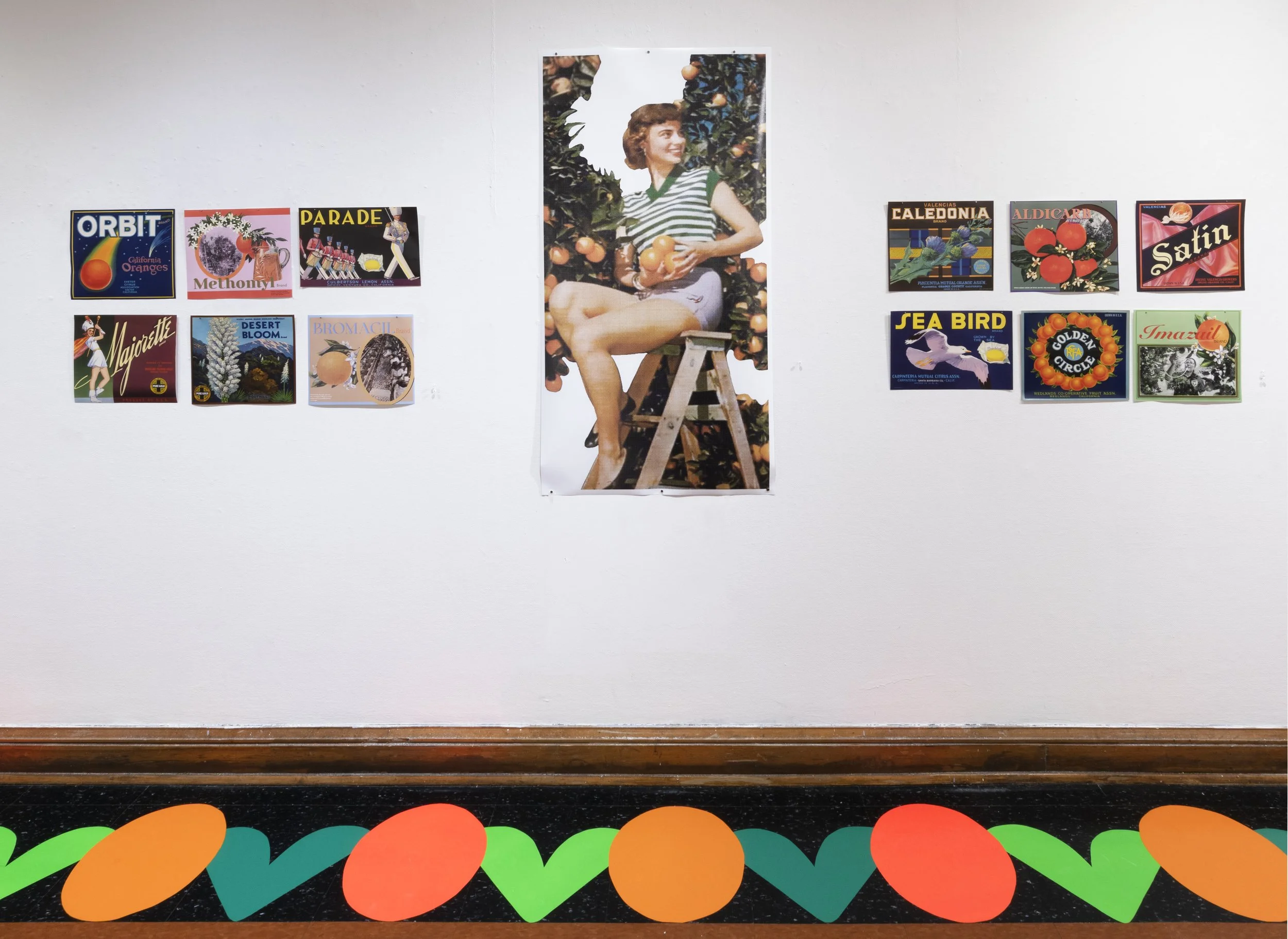 The vinyl floor installation is based on the border pattern from a pamphlet advertising the town of Riverside, California— the place where from two Navel orange trees, Sunkist would eventually be established. For a time, oranges would make Riverside the richest town per capita in the US. Tourists marveled at its grand mansions and manicured parks with the California Citrograph later stating, “a deep appreciation for the beautiful is not inconsistent with commercial success in orange growing.”