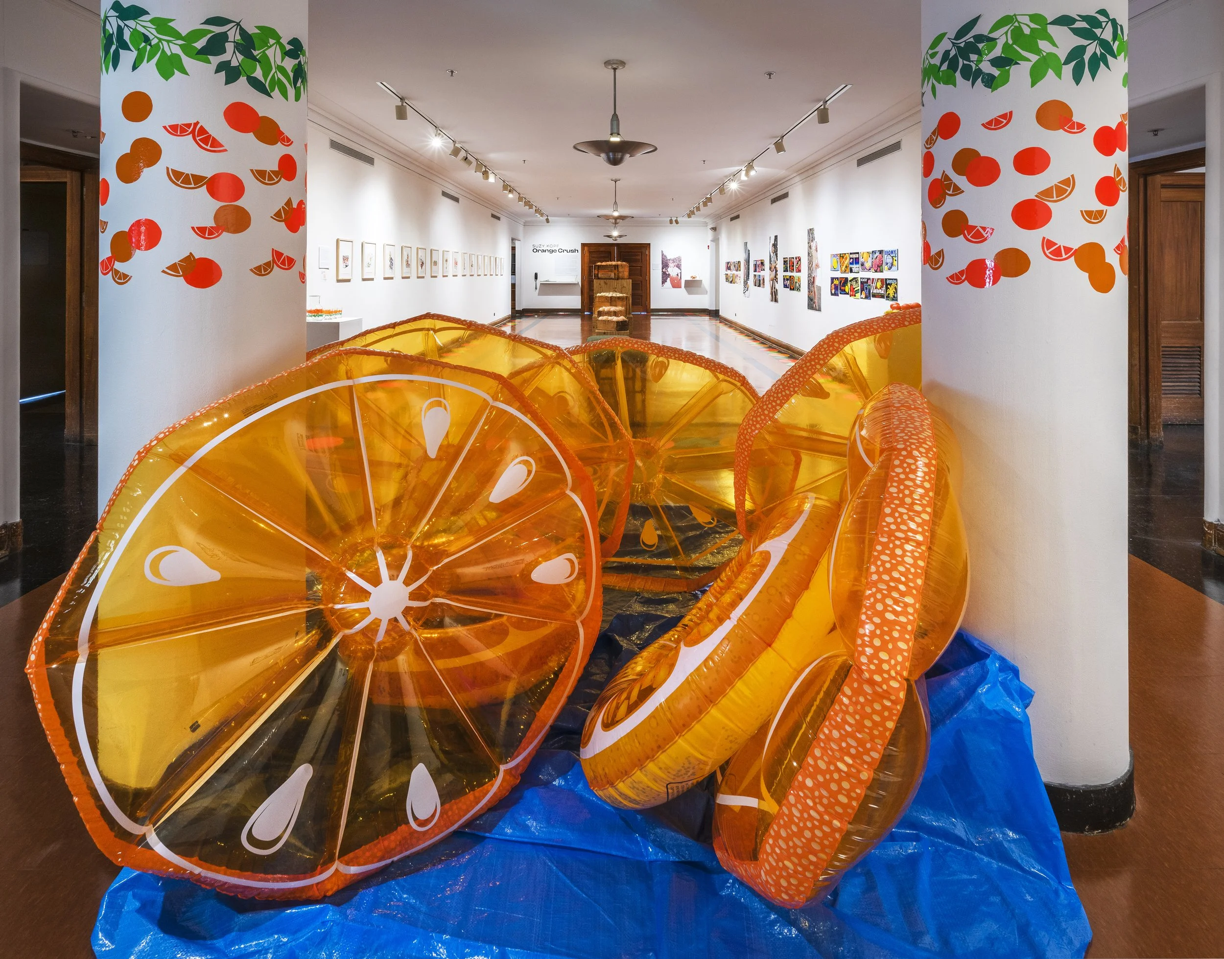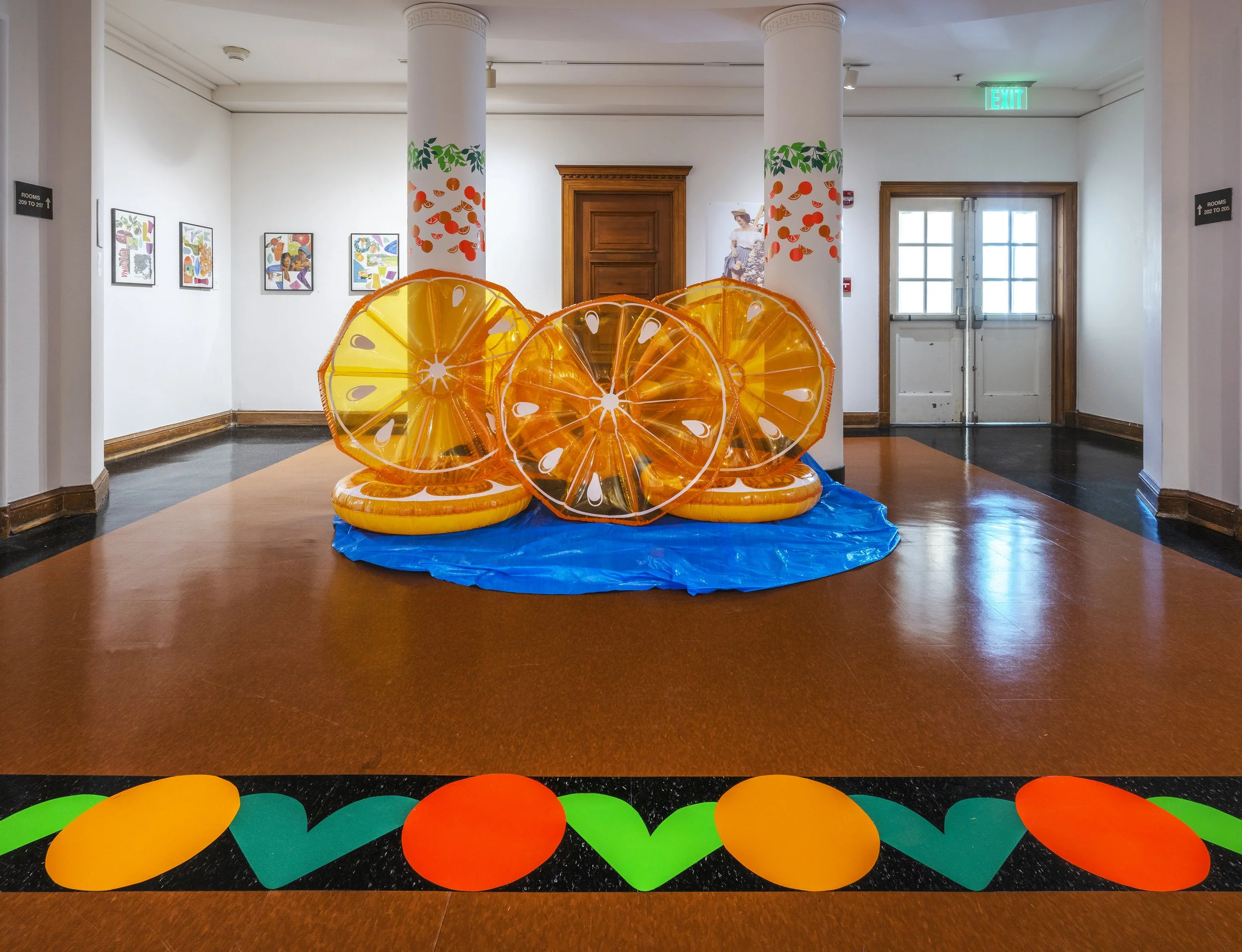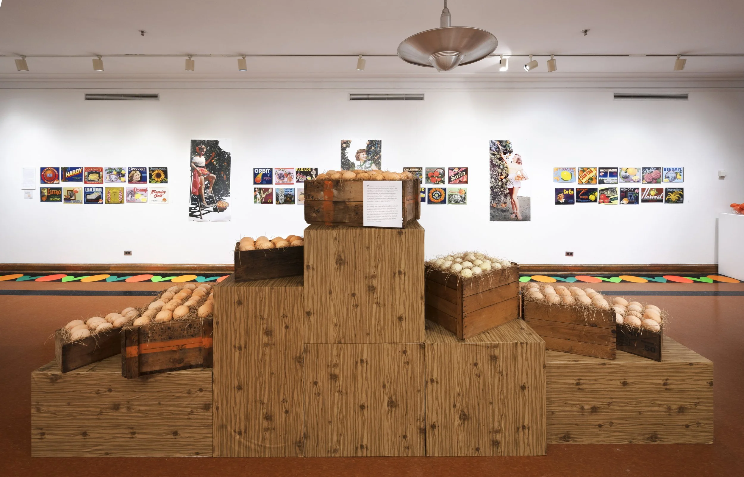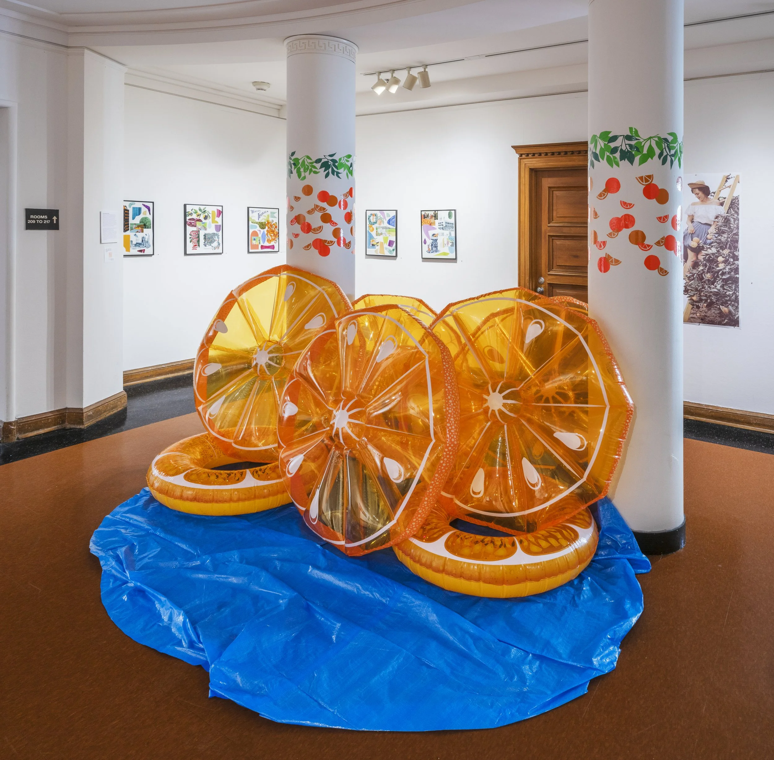 The vinyl floor installation is based on the border pattern from a pamphlet advertising the town of Riverside, California— the place where from two Navel orange trees, Sunkist would eventually be established. For a time, oranges would make Riverside the richest town per capita in the US. Tourists marveled at its grand mansions and manicured parks with the California Citrograph later stating, “a deep appreciation for the beautiful is not inconsistent with commercial success in orange growing.”