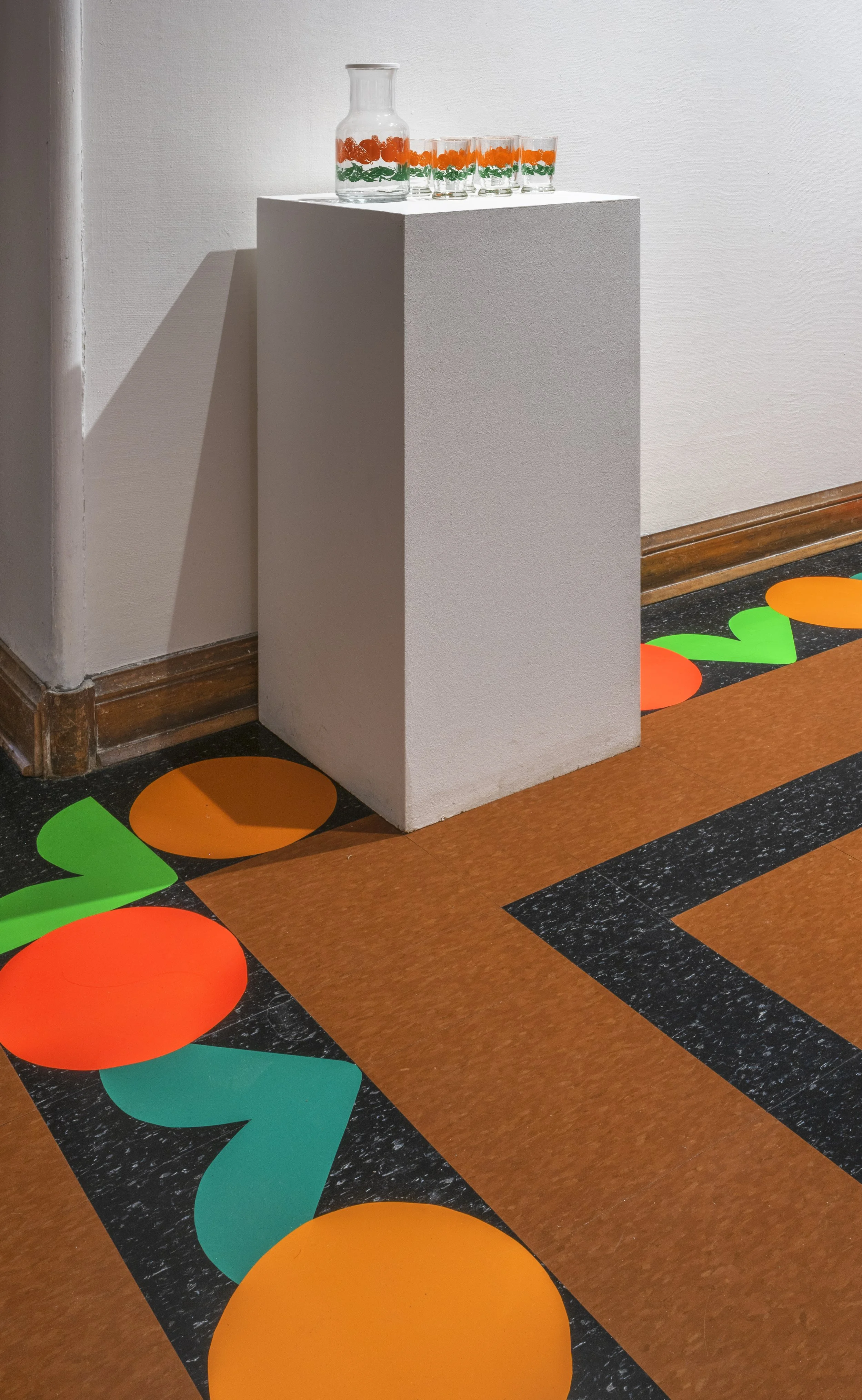 The site-specific vinyl installations on the columns of the gallery were inspired by a range of midcentury orange juice glassware designs. Enlarged here and removed from the context of the domestic, the designs become abstract gestures on a well-worn theme. Like the glassware itself, much of which survives in mismatched sets sold second-hand, this installation was ephemeral and removing it at the exhibition’s conclusion destroyed it.