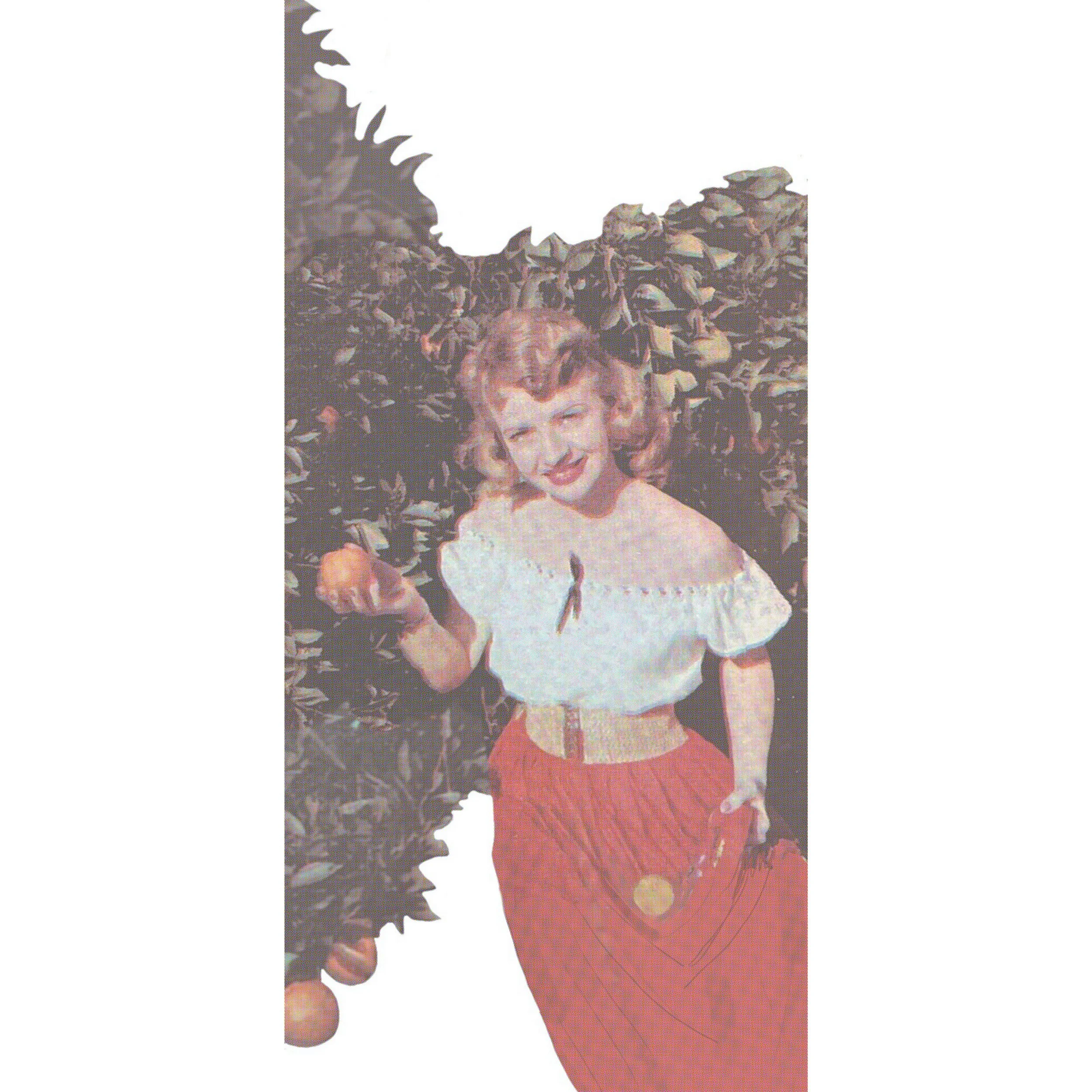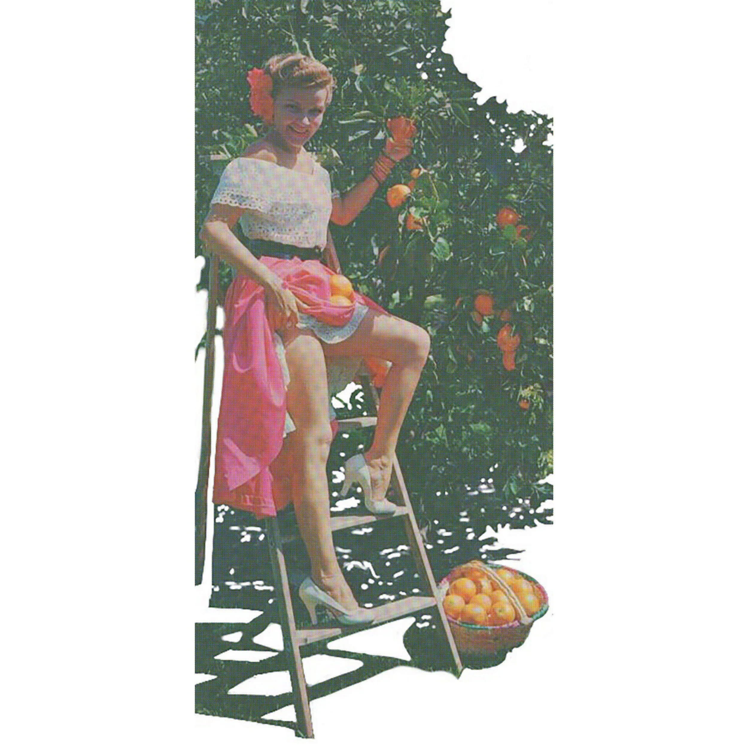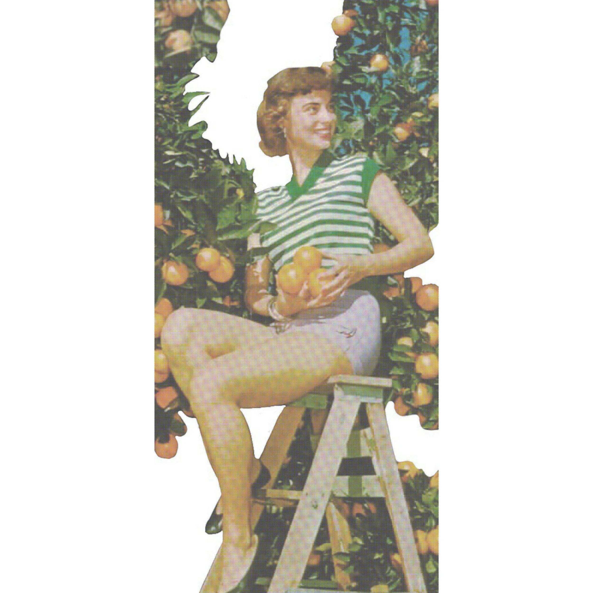 These scaled-up photos of young white women posing in orange groves are adapted from pre-WWII pamphlets advertising citrus-centric towns in Florida and California hoping to grow their populations. The original imagery appears in context with other “offerings” of these typically newly incorporated towns— factories, suburban housing, and fresh infrastructure— with the male gaze almost comically front of mind. Very little is known about the individual women who posed for these photos— were they models or were they workers in the orange industry at all? If so, it’s unlikely they were fruit pickers as the photos imply, that exhausting labor was reserved for male workers, many of whom were BIPOC. If the women seen here worked for the factories, they were most likely packers, working on an assembly-line inside a packinghouse, repeatedly washing, grading (sorting the fruit by size), delicately wrapping citrus in tissue paper and placing it in wooden crates. Like their male counterparts in the groves, packers were paid “piece rate wages,” meaning a good worker was fast but a well-paid worker was faster.